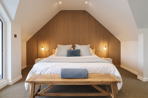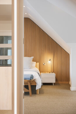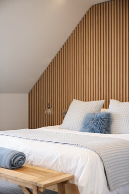 Die gemütlichen Holzlatten am Kopfende des Bettes runden diese Master-Suite perfekt ab. Auch im anschließenden Ankleidezimmer verleihen die Spiegelrahmen und Schrankwände aus Holz dem Raum eine schöne Note. Und zum Schluss wurden natürlich Precolor Easy und Oil Plus 2C in neutralen Tönen aufgetragen!